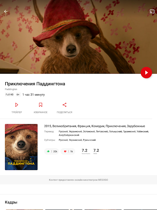 • Удобная система рекомендаций. После просмотра оценивайте и пишите отзывы к фильмам, сериалам и мультфильмам и формируйте тем самым подборки видео, которое подойдет именно вам.