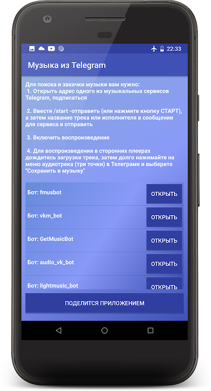 - Приложение поможет вам использовать мессенджер Телеграм для прослушивания бесплатной музыки, поиска музыкальных коллекций и композиций