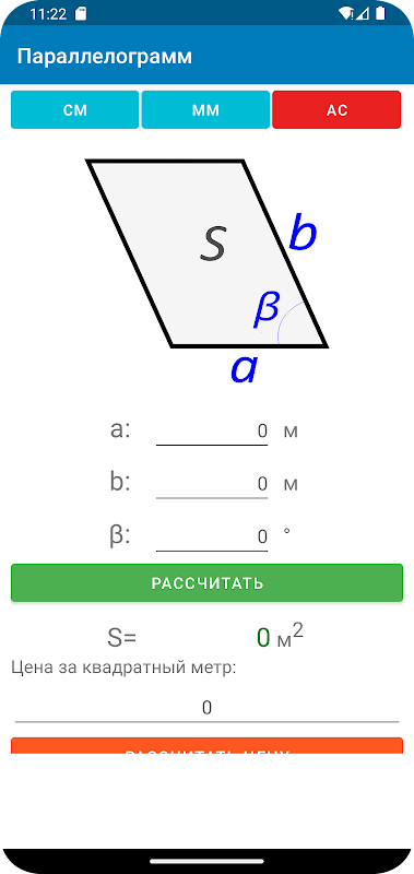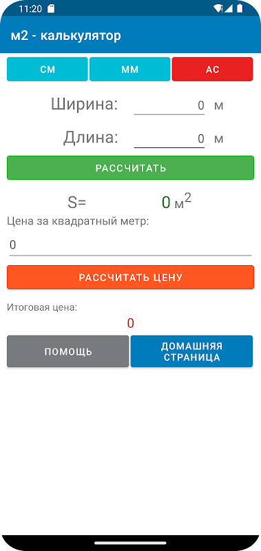 평방 미터를 계산하고 특정 면적의 총 비용을 계산하는 응용 프로그램입니다.