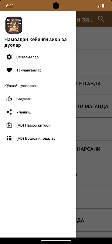 Ilovamizda barcha namozdan keyingi zikrlar va doular jamlangan. Ilovamizda tungi 정권 va hamda izlash funksiyasi ham mavzhud, tanlanganlar ruyhat ham qiritilgan. Ŏkish 정권 siz 글꼴 kattarok va kichikrok qilishingiz mumkin. Zikrlar va duolarni holagan dўstingizga yuborishingiz mumkin.