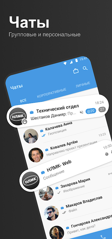NLMK Connect는 인스턴트 메시지를 교환하고, 음성-영상 통화를 하고, 일반 채팅 및 커뮤니케이션 그룹을 만들 수 있는 도구입니다.