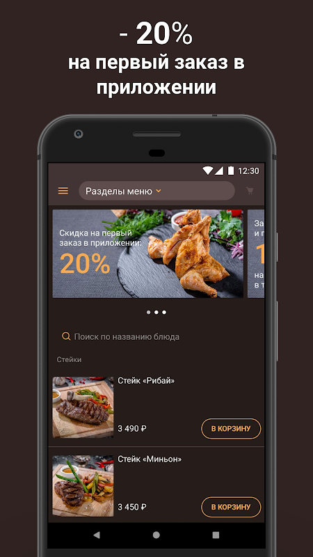 뛰어난 미식 요리 레스토랑의 백인 요리 배달 "Novorizhskoye의 전초 기지." 할인 - 응용 프로그램에서 이후의 주문에 대해 10 % - 제 20 %!