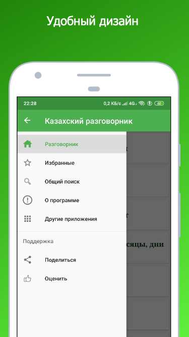 Удобный дизайн. Вы легко сможете скопировать фразы, поделиться или ж просто сохранить в избранное. Удобный поиск дает вам возможность поискать казахские или русские фразы. И самое главное приложение не требует интернет подключения.