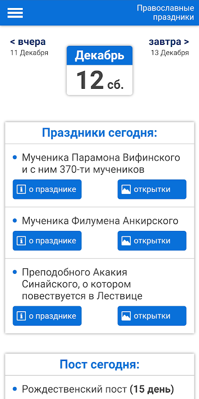 엽서, 정교회 (교회) 휴일, 금식, 이름 날 및 표지판이 포함 된 절대 무료 응용 프로그램은 항상 정통 행사를 따라 잡을 수있을뿐만 아니라 엽서로 사랑하는 사람과 친구를 축하하는 데 도움이됩니다. 더 이상 검색 할 필요가 없습니다.이 휴일이 언제인지 누군가에게 물어보세요. 우리는 당신을 위해 해냈습니다. 모든 정교회 공휴일의 편리한 달력은 다가오는 공휴일에 대해 알려줄 것이며 그 의미에 대한 기억을 새로 고칠 수도 있습니다. Great Orthodox Holidays는 별도로 강조 표시됩니다. 특히 기독교인의 중요한 행사를 미리 준비 할 수 있습니다. 금식이 언제 시작되고 끝나는 지 알게 될 것입니다. 민속 표지판뿐만 아니라 그들이 가지고있는 것 및 기대할 것.