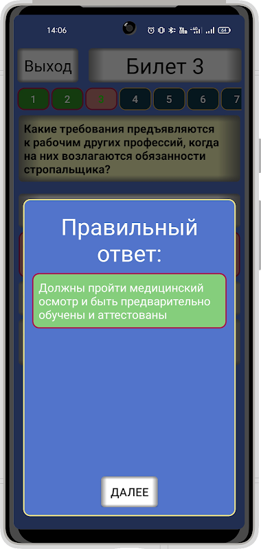 - "시험". 이 카테고리를 선택하면 앱이 무작위로 티켓 중 하나에 대한 접근 권한을 부여합니다. 여기서는 오류가 발생할 경우 애플리케이션이 더 이상 정답을 표시하지 않습니다. 사용자는 마지막에 시험 결과를 볼 수 있으며, 선택한 티켓에 대한 결과와 정답 수가 선택한 카테고리인 "시험"의 애플리케이션 메인 화면에 저장됩니다. 시험에 실패하면 "준비" 또는 "훈련" 카테고리로 돌아가서 실패한 티켓을 다시 제출할 수 있습니다.
