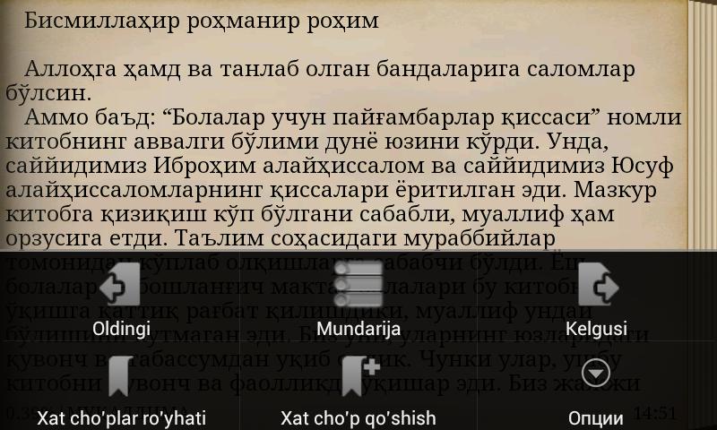 * Китобда Ўзбек шрифти ишлатилгани сабабли баъзи Андроид ускуналарида арабча матн яхши чиқмаяпти. Инша Аллоҳ келгусида бу муаммони бартараф қилишга харакат қиламиз.