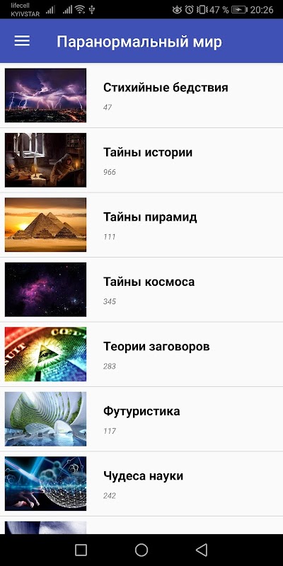 부록 초자연 세계에는 이상 현상, 문명의 수수께끼, 초자연 현상, 신비주의, UFO와 광경, 평행 세계, 역사의 비밀, 세계 현상 등에 관한 약 10,000 기사가 들어 있습니다. 응용 프로그램은 야간 모드 및 오프라인 모드 (인터넷 제외)를 지원하며 검색, 즐겨 찾기가 있습니다. 초자연적 인 세계 앱은 각 카테고리에서 중단 한 곳을 기억합니다. 덕분에 나중에 같은 장소에서 다시 읽을 수 있습니다. 또한 기사를 읽은 상태 (녹색 플래그) 또는 읽은 상태 (노란색)로 표시합니다.