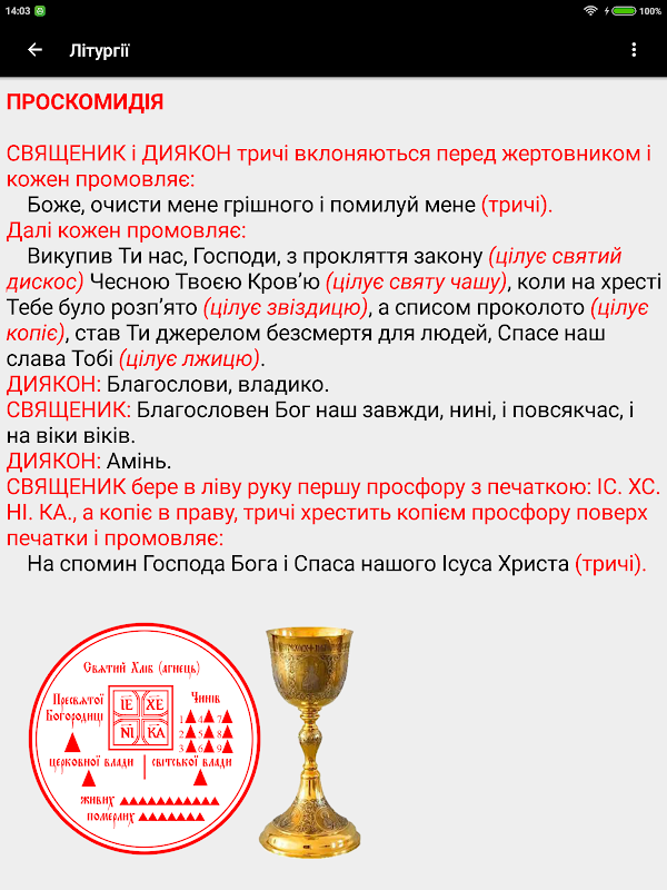 키예프 2012 년 UOC-KP 출판사 "Sluzhebenyk"가 기본으로 채택되었습니다. 이 부록에는 성스러운 거룩한 예배식이 포함되어 있습니다. 존 크라이 소톰, 세인트 큰 선물과 미리 만들어진 선물 바질. 텍스트 크기 설정과 야간 모드가 있습니다.