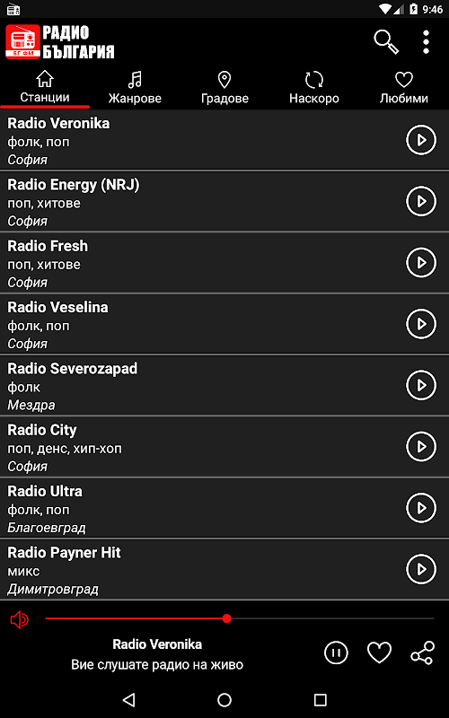 휴대전화에서 인기 있는 불가리아 라디오 방송국 목록을 검색하여 도시 또는 장르를 선택할 수 있습니다. 라디오 방송국 목록은 응용 프로그램의 인기도에 따라 정렬됩니다. 좋아하는 라디오 방송국을 선택하고 "실행"을 누르자마자 애플리케이션은 백그라운드에서 계속 작동하지만 휴대전화는 무료로 사용할 수 있습니다.
