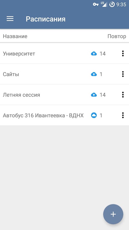Добавьте в приложение любое расписание, которым вы пользуетесь в жизни. Будь то расписание транспорта, расписание учёбы или любое другое расписание.