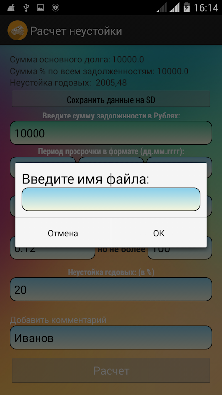 이 프로그램은 페널티 (벌금, 처벌)을 계산합니다. 그리고 그것은 SD에 데이터를 저장하는 것도 가능하다. 당신이 부채 (RUR)의 양, 지연 시간, 하루 또는 연간이자 금액을 설정하는 데 필요한 계산을 수행합니다. 이 프로그램은 (각 월의 일 수를 정확하게 볼 수있는) 양을 계산합니다.