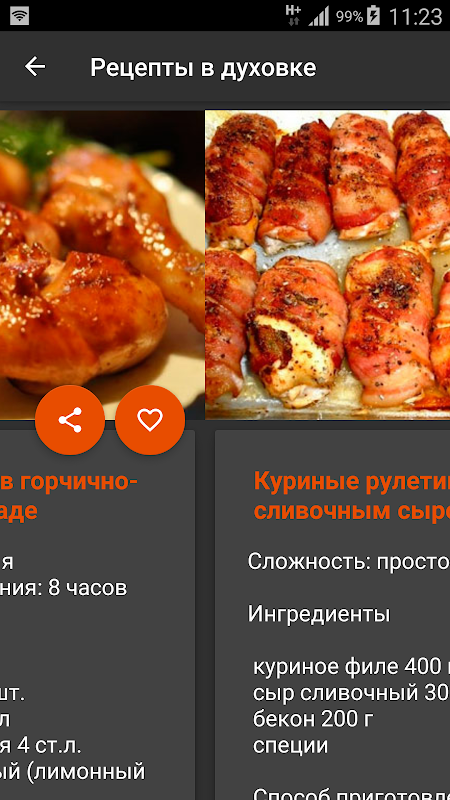 "오븐에서 요리법"응용 프로그램은 편리하게 구성되어 있으며, 얼마나 많은 인분, 조리 시간, 필요한 재료가 무엇인지, 따라서 조리 방법 자체를 볼 수 있습니다.