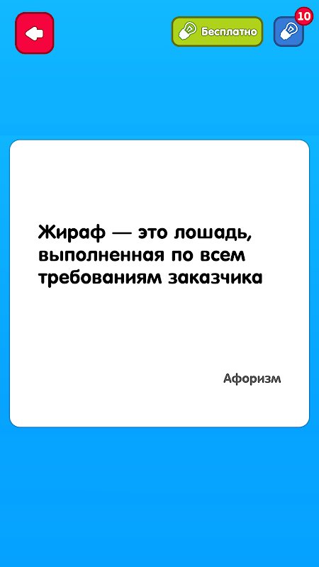 Слишком просто? 😉 Скачайте нашу игру и попробуйте пройти все загадки, составляя из букв правильные слова. Переставляйте буквы пальцем на поле, чтобы получить ответ к каждому ребусу. После того, как вы отгадали слово, вас ждет приз — шутка, афоризм или умная цитата на данную тему. Обновите свой статус в социальных сетях, с помощью нашей игры