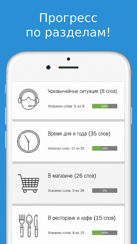 선택한 주제에 대한 테스트를 통과하면 오류를 볼 수 있습니다. 또한 각 주제별 시험 합격 결과가 저장되며, 선택한 주제의 모든 단어를 100 % 학습하는 것이 목표입니다.