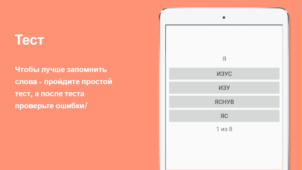 선택한 주제에 대한 테스트를 통과하면 오류를 볼 수 있습니다. 또한 각 주제별 시험 합격 결과가 저장되며, 선택한 주제의 모든 단어를 100 % 학습하는 것이 목표입니다.