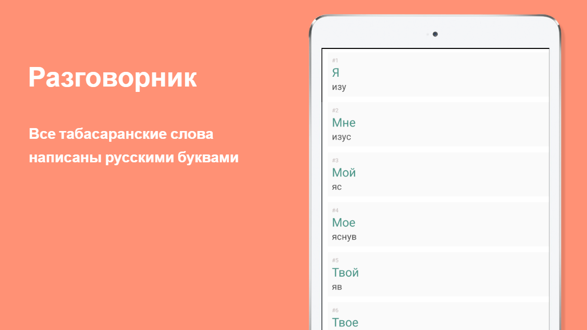 러시아어-타 바사 어 관용구는 각각 관용구와 타 바사 어를 배우기위한 도구로 사용할 수 있습니다. 모든 Tabasaran 단어는 러시아어로 작성되었으며 15 개의 논리적 주제로 나뉩니다. 즉, 관용구는 러시아어를 사용하는 사용자 (관광객)를 위해 설계되었습니다.