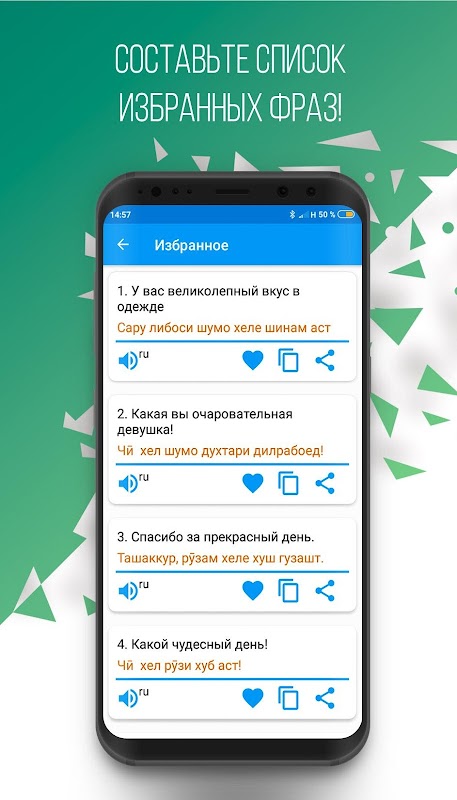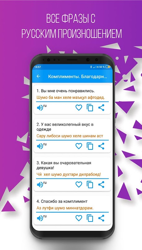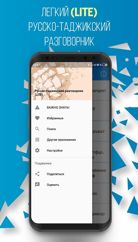 이 관용구는 프로그램 "Russian-Tajik 관용구"의 새롭고 쉬운 버전이며 타직 어와 러시아어를 아는 사람들 간의 의사 소통에 유용 할 수 있습니다. 이러한 종류의 다양한 국제 간행물 분석을 기반으로 작성되었습니다. 관용구에는 다음과 같은 주제에 대해 대담 자 간의 본격적인 의사 소통에 필요한 가장 일반적이고 사용되는 문구, 말의 전환 및 주제가 포함됩니다. 일상 문구 ","여행 ","호텔 ","레스토랑에서 "," 쇼핑 ","여행 ","의사 소통 수단 ","은행에서 ","교통 ","건강 ","미용실 ","경찰에 전화 ".