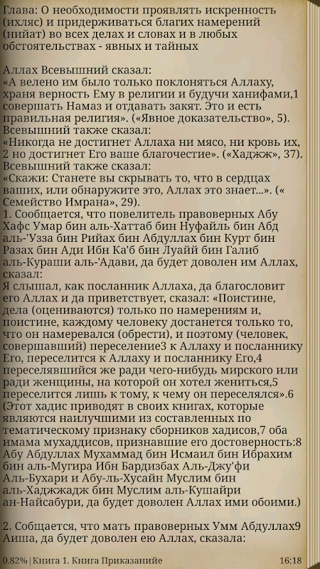 이맘 - Nawawi, "리야드 알 - Salihin"의 하디스의 컬렉션은 가장 유명한 중 하나이며 책의 이슬람 세계에 사랑. , 한편으로는 꾸란 이후 중요성이 두 번째 이슬람의 교리, 다른 한편으로는, 그 컴파일러가 존중 된 학자의 기초 예언자 sallallaahu 'alaihi WA sallam, 그의 인생의 Sunnah에의 일부를 포함하고 있기 때문에 이것은 놀라운 일이 아니다 이슬람의 서비스에 헌신. 놀라운 다른 : 하디스의 많은 컬렉션이 있지만 이러한 인기는 평판 개인 이상으로 구성, 책을 획득 한 이유는 무엇입니까? 제 생각에는, 그 이유는 주제 (musannaf)에 의해 분산 재료의 매우 성공적인 배열과 컬렉션의 삼백일흔둘 장 각 hadith에 대한 동등하게 좋은 선택이 될 것입니다.
