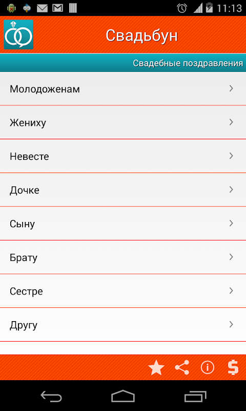 Из приложения можно посылать смс или e-mail с выбранным поздравлением жениху и невесте. Можно очень быстро найти подходящий тост для себя и для соседа.
