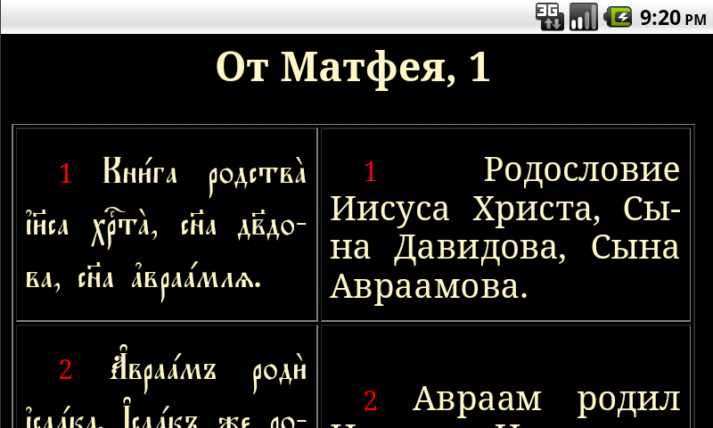 러시아와 교회 슬라브어의 거룩한 복음. 러시아어 주교 대의원회의 후속 번역에 제시되어있다.