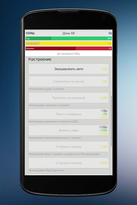 Симулятор гаишника - шуточное приложение симуляции жизни типичного гаишника. Не стоит воспринимать всё всерьез, но элементы правды не упущены:) Попытайтесь выжить как можно дольше, постоянно проходя проверки квалификации и останавливая всё больше и больше авто. Поднимайтесь по карьерной лестнице, улучшайте аксессуары и ваша жизнь превратится в сказку!