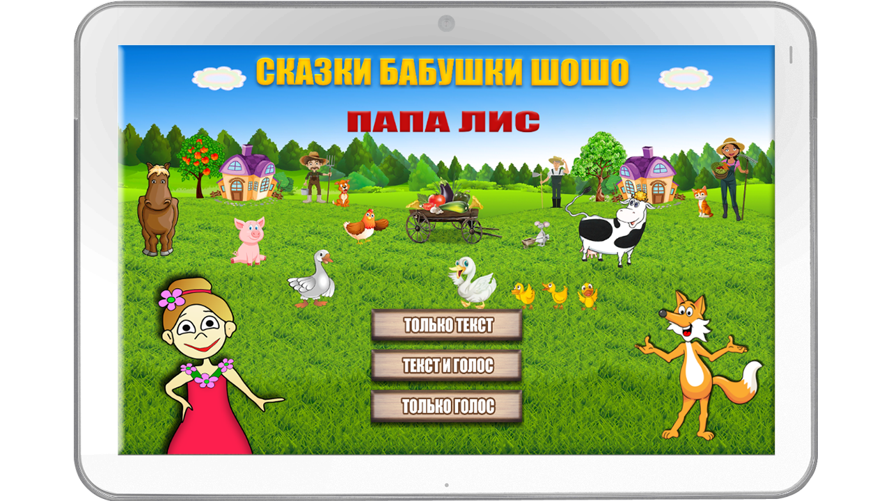 Вы можете нажимать на персонажи, отключать и включать текст для чтения, а так же включить опцию аудиосказка и прослушать историю о приключениях папы Лиса. Надеемся вы поддержите бабушку Шошо добрыми комментариями и тогда, мы запустим целую серию приложений " Сказки для детей от бабушки Шошо".