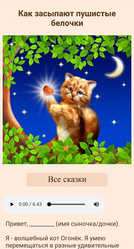 응용 프로그램에서 마술 고양이 Ogonyok은 잠드는 방법을 알려줍니다.