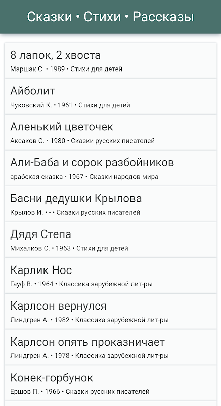 В приложении в сможете найти различные сказки, рассказы и стихи. Сказки представлены в виде слайдов с голосовым озвучиванием. Авторы сказок: Маршак, Пушкин, братья Гримм, Чуковский, Линдгрен, Крылов и д.р. Русские произведения: Сказка о золотом петушке, Сказка о мертвой царевне и семи богатырях, Сказка о попе и работнике его Балде, Сказка о царе Салтане.