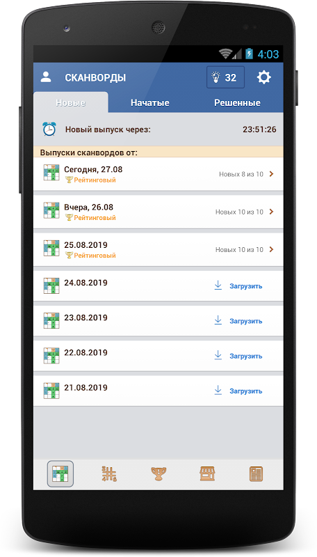 ⚙ Для загрузки новых ежедневных сканвордов необходимо соединение вашего мобильного устройства с Интернетом.