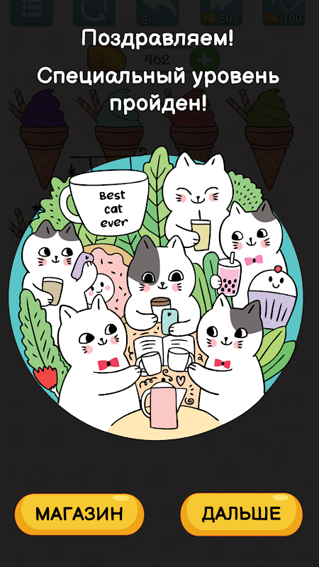 - 컵에 한 가지 색상을 채운 후 나타나는 배경과 고양이를 변경할 수 있습니다.