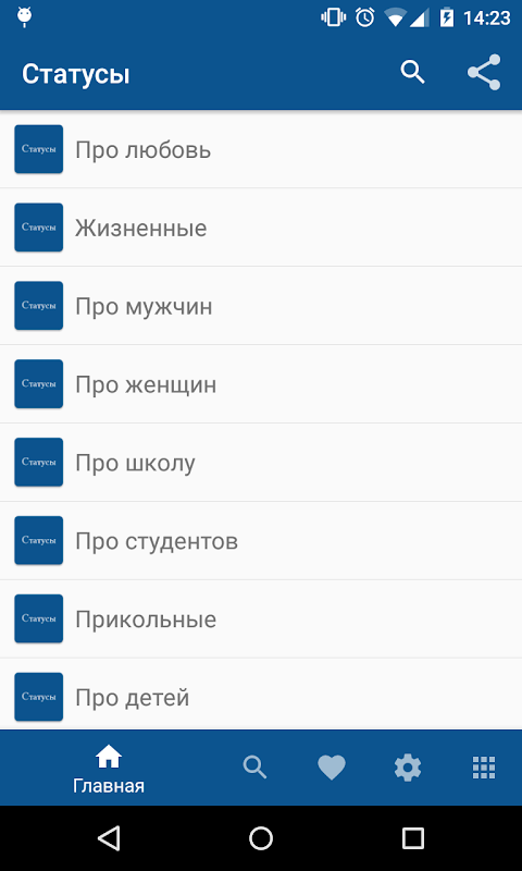 Статусы: Про любовь, Жизненные, Про мужчин, Про женщин, Про школу, Про студентов, Прикольные, Про детей, Про друзей, О счастье, Времена года, Про семью, Кавказские, Одиночество, Расставание, Обида, Новогодние праздники и разные.