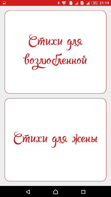 사랑에 대한 부록 시집은 당신이 사랑하는 사람 매일, 아름 다운, 독특한 구절을 기쁘게하는 데 도움이 될 수 있습니다. 데이터베이스는 참여하지 않고 매일시를 업데이트 이상 천의 총 전류 수있다. 각시는 신속하게 스마트 폰에 저장하거나 편리한 방법으로 사랑하는 사람 원터치을 보낼 수 있습니다 - 메일, 소셜 네트워크, 인스턴트 메신저로.