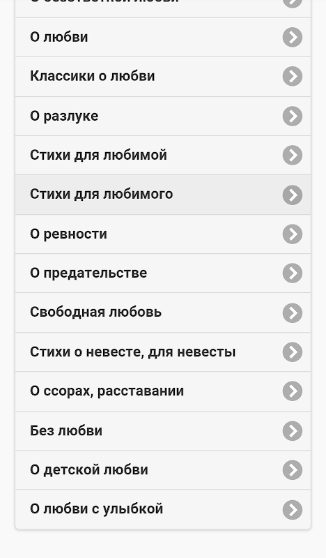 Стихи о любви красивые и трогательные стихотворения о любви классиков и современных поэтов. Стихи о любви это песня влюбленной души, парящей на крыльях любви. Романтичная и влюбленная девушка может рассказать о своих чувствах, любимому парню. А если ты парень, то сможешь оригинально поведать о своих чувствах в стихах любимой девушке. Вы сможете посмотреть какими разными бывают стихи о любви, как и сама любовь, найдете стихи о грустной и о счастливой любви, стихи про печальную и про красивую любовь и многое другое. Найдя подходящий стих о любви, вы сможете отправить его любимому человеку прямо из приложения.