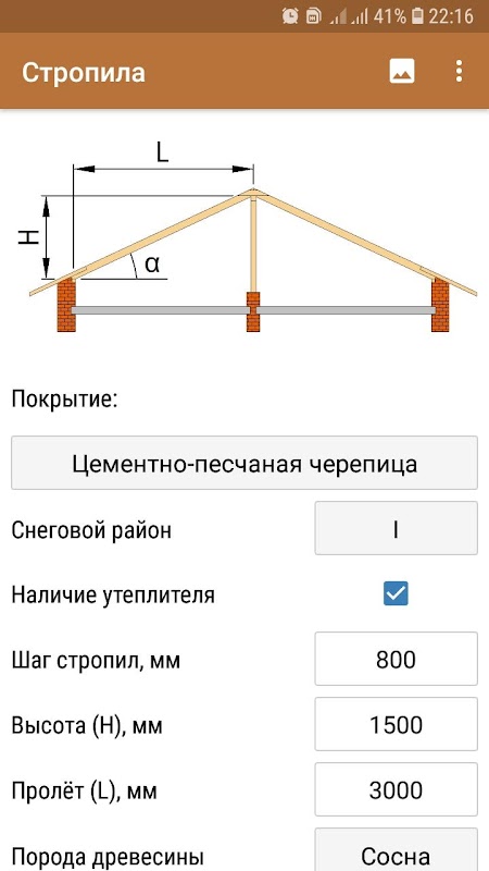 응용 프로그램에서지지 지붕 구조 (래프터)가 계산됩니다.