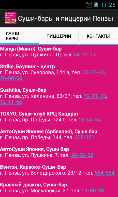 Приложение "Суши-бары и пиццерии в Пензе" это справка по суши-барам и пиццериям для Вашего мобильного устройства! Вам всегда будет доступна основная информация по Cуши-барам и Пиццериям в Пензе.