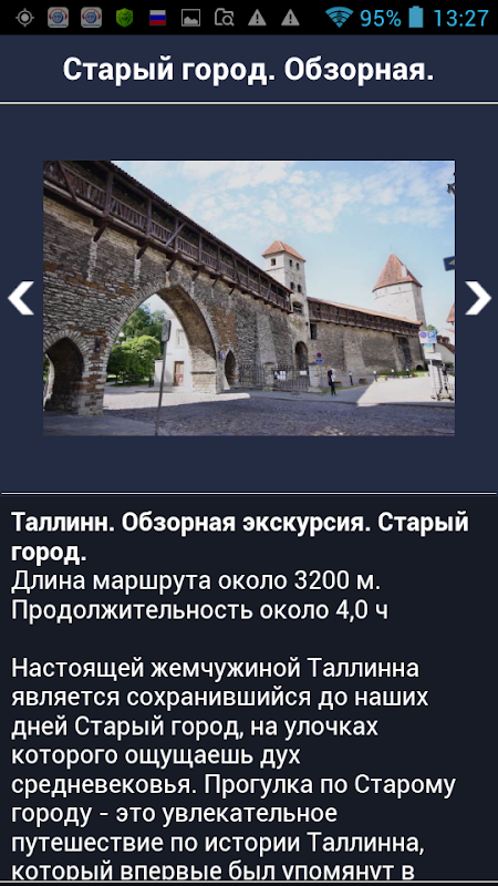 ● 탈린 오디오 가이드. 오디오 가이드의 내레이션은 녹음 스튜디오에서 전문 내레이터가 녹음했습니다. 내비게이션을 들으면 관광 중 방해 요소를 피하고, 작은 화면에서 텍스트를 읽으며 시간을 낭비하고, 시력을 손상시키는 것을 방지할 수 있습니다.