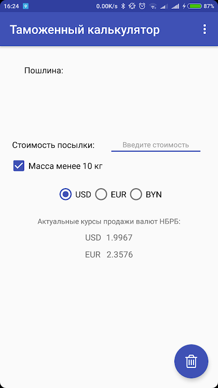 소포에 대한 수수료의 계산 해외에서 (벨로루시의 주민).