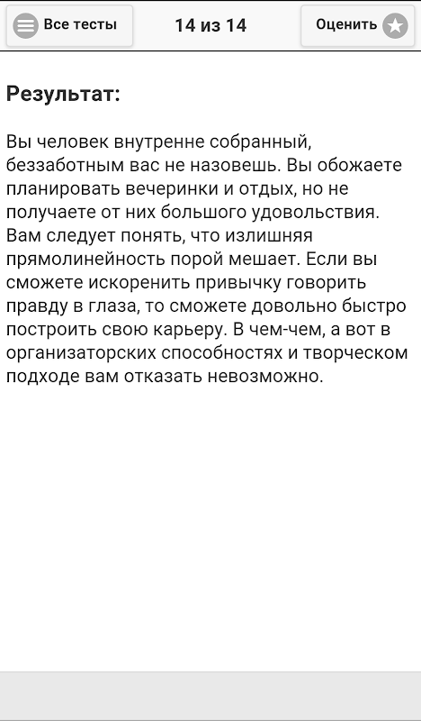 Приложение позволит вам пройти популярные психологические тесты с автоматическим подсчётом результатов. Хотите узнать каковы ваши психологические особенности? для этого пройдите не сложные и быстрые тесты по психологии прямо сейчас. Результат тестов вы получаете совершенно бесплатно. Узнавайте больше о себе и ваших близких, разбирайтесь в отношениях со своей второй половинкой. Психологические тесты - это доступный способ определения черт вашего характера, поведения, свойств личности, способностей конкретного человека, особенностей взаимоотношений между людьми. Тесты позволяют увидеть себя по-новому, посмотреть со стороны и заглянуть внутрь себя. В приложении собрано большое количество психологических тестов, проходя их узнавайте новое о себе.