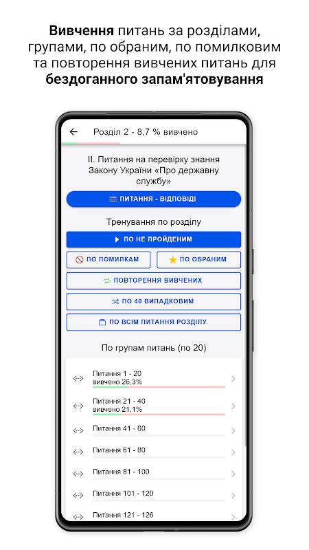 우크라이나 국립 공무원 기관의 명령에 의해 승인된 공무원 카테고리 "A", "B", "B"의 공석 경쟁을 위한 테스트 작업에 대한 고품질 교육을 위한 업데이트된 시뮬레이터(변경 사항 포함) NADS의 명령에 따라 작성됨) "답변 옵션이 포함된 법률 지식에 대한 시험 문제 목록"입니다.