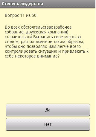 이 시험은 리더십 자질의 지배력의 정도를 결정하기 위해 설계되었습니다. 관리 역량 관리자의 리더십의 단위 테스트에 포함되어 있습니다. "테스트는 각각 두 개의 서로 다른 답변을 50 문항으로 구성되어 있습니다. 프로그램 방해 시험, 메뉴를 통해 저장된 테스트 지속 가능성, 및 테스트를 다시 시작할 수있는 능력을 계속하는 기회. 응용 프로그램은 오프라인으로 작동합니다. 광고없이.