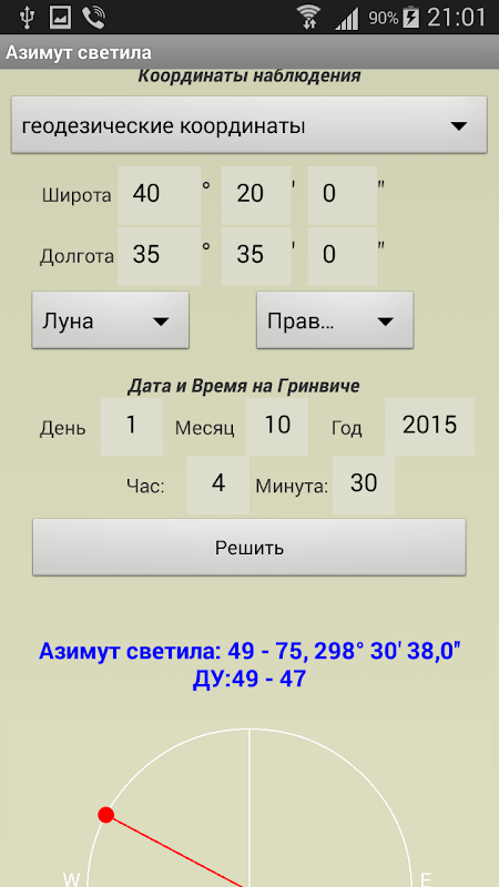 -주어진 시간에 별의 방위각. 태양, 북쪽 별;