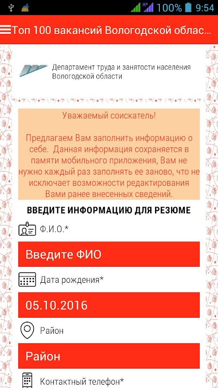 Mobile application with the database of current vacancies in the region