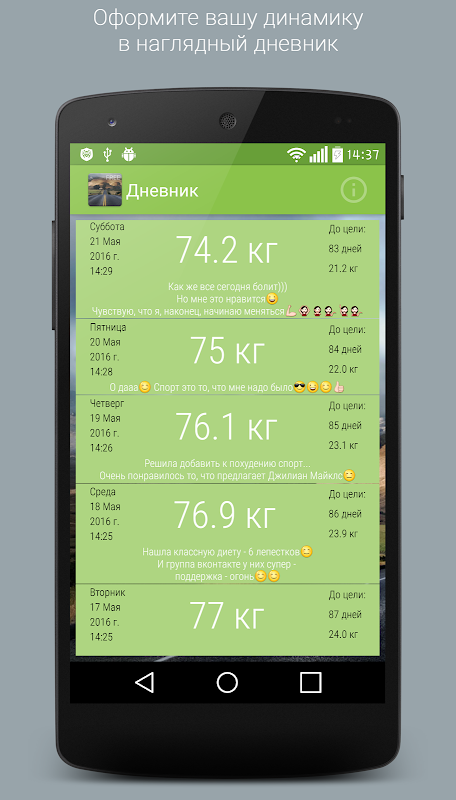 그리고 의심 또는 성공의 순간에 당신의 감정을 일기에 기록 할 수 있습니다. 그리고 여기 당신이 국한되지 않습니다 - 모든 노트 확실히 충분한 장소 :-)