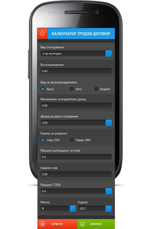 Калкулатора служи за изчисляване на възнаграждения на лица, работещи по трудов договор, граждански договор, или ДУК, както и за изчисляване на осигурителните вноски за самоосигуряващи се лица.