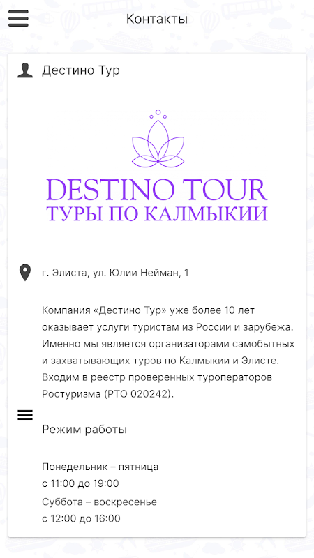또한 응용 프로그램에서 날씨에 대한 간략한 요약, 최신 관광 뉴스, 칼미키아에서 독특한 여행을 조직하는 여행사 연락처 정보를 찾을 수 있습니다.