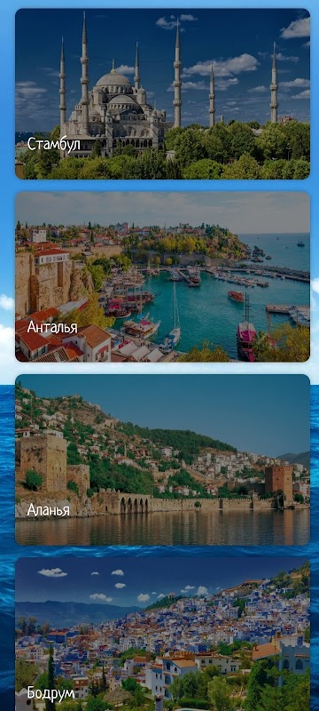 신청서를 통해 터키 도시에 대해 처음 알아보고, 여행할 장소를 선택하고, 명소를 감상하고 비디오 리뷰를 볼 수 있습니다. 이 응용 프로그램에는 선택한 도시에서 서비스를 제공하는 여행사, 여행사 및 호텔에 대한 정보도 포함되어 있습니다.