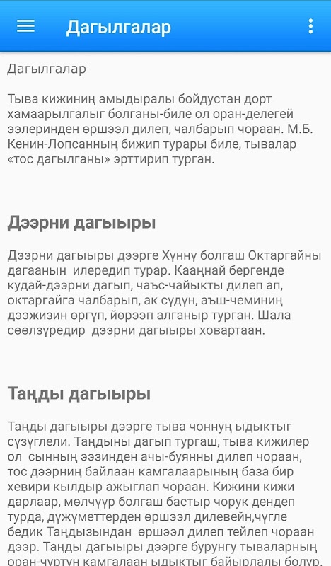 이 응용 프로그램에는 "Shagaa", "Doylar", "Dagylgalar", "Tyva Chener", "Tuva Oyunnar", "Tuva Ug"와 같은 관련 섹션이 있습니다. “Shagaa”섹션에 들어간 젊은이들은 예를 들어 Shagaa 축하의 역사, 예식과 의식의 신성한 실제 의미에 대해 배울 수 있습니다.