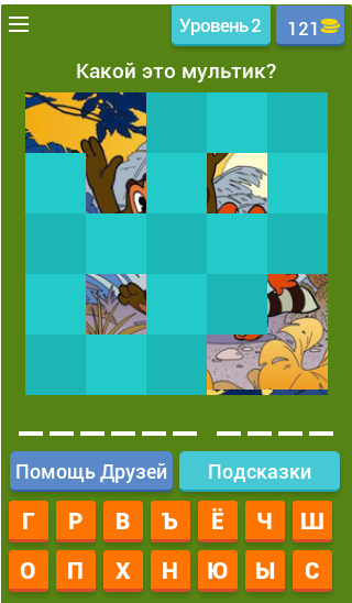 Изображение закрывают плитки, открыв часть картинки нужно догадаться как называется мультфильм или герой. (В зависимости от вопроса).