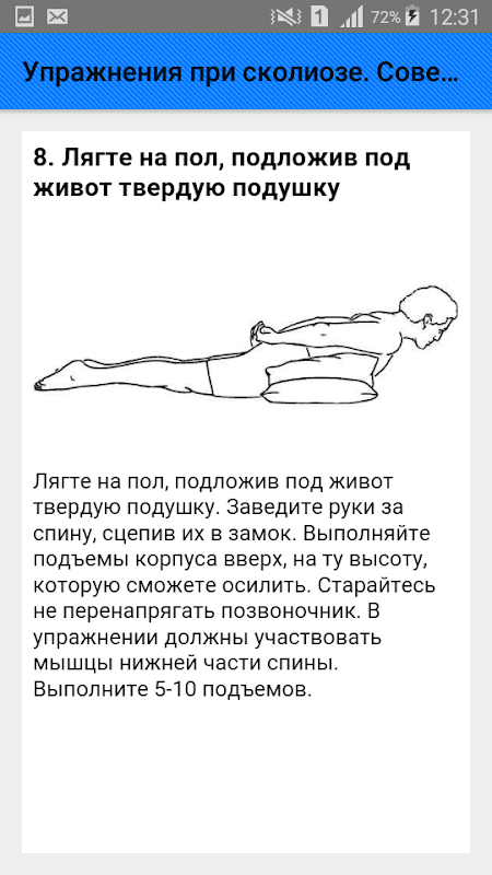 척추 측만증은 척추의 측면 곡률이며 모든 부서에서 모든 방향으로 가능합니다. 이미 질병의 초기 단계에서 척추와 디스크의 내부 장력이 급격히 증가합니다. 척추가 뻣뻣 해지고 융통성이 없어집니다. 병리학 적 과정은 가속화 된 속도로 발전하고 있습니다. 척추가 다양한 과부하를 견딜 수있는 능력이 감소합니다. 질병의 초기 단계에서 척추 측만증을 치료하는 가장 효과적인 방법 중 하나는 운동 요법 (물리 요법)입니다. 척추 측만증에 대한 치료 운동은 매우 매끄럽고 부드럽게 수행되어야합니다. 갑작스런 움직임은 제외해야합니다. 이것은 척추와 추간판의 부상을 예방할 것입니다.
