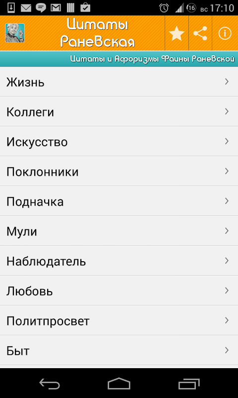 Установи приложение с цитатником Раневской - и перечитывай мудрые и остроумные фразы блистательной актрисы, которые поднимут тебе настроение и научат воспринимать жизнь проще.